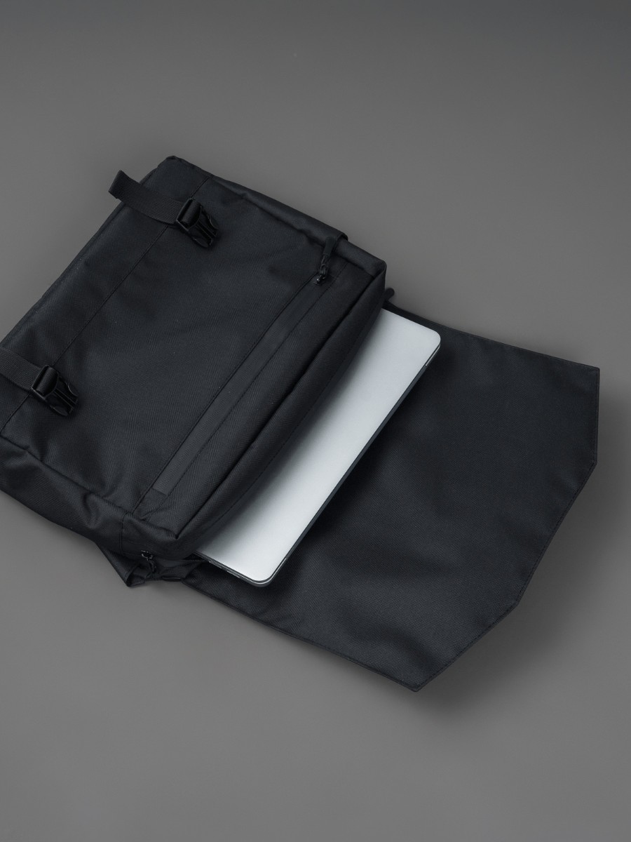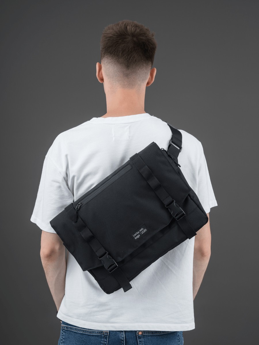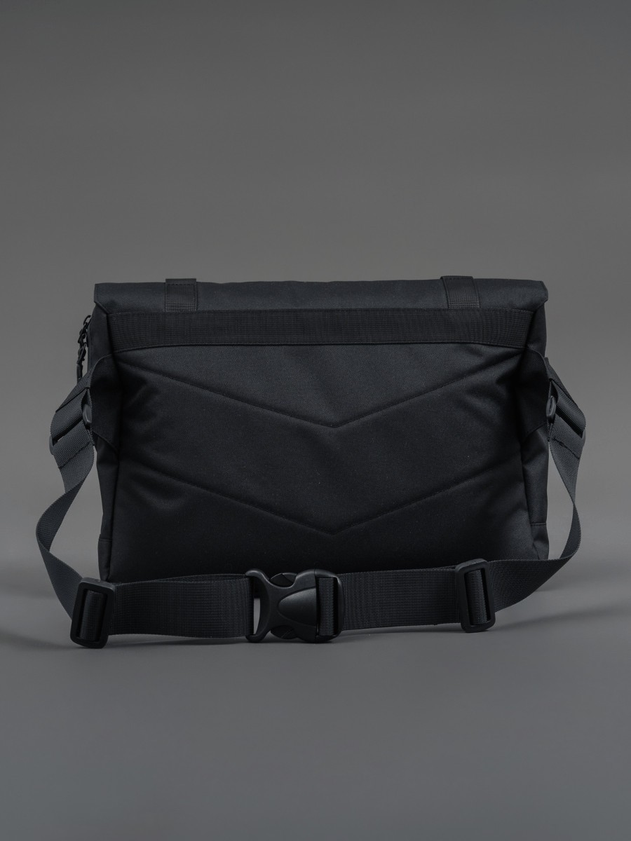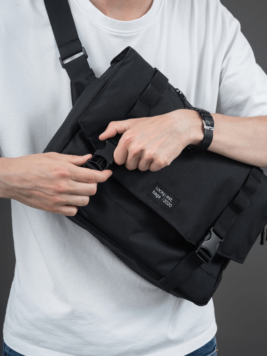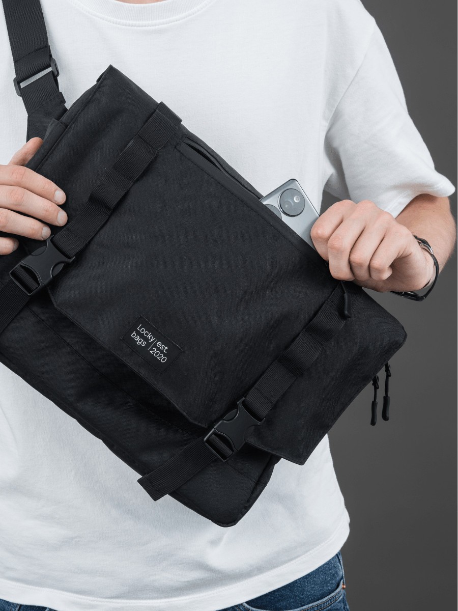 Сумка-слинг для твоего повседневного удобства черного цвета. Сделан из влагонепроницаемого нейлона, содержимое в безопасности от непогоды. Водостойкие молнии. Один карман на передней стенке для мелочевки. Один большой карман сразу за клапаном. В основном отделении карман для ноутбука/планшета до 14″ и кармашки для мелочи.
